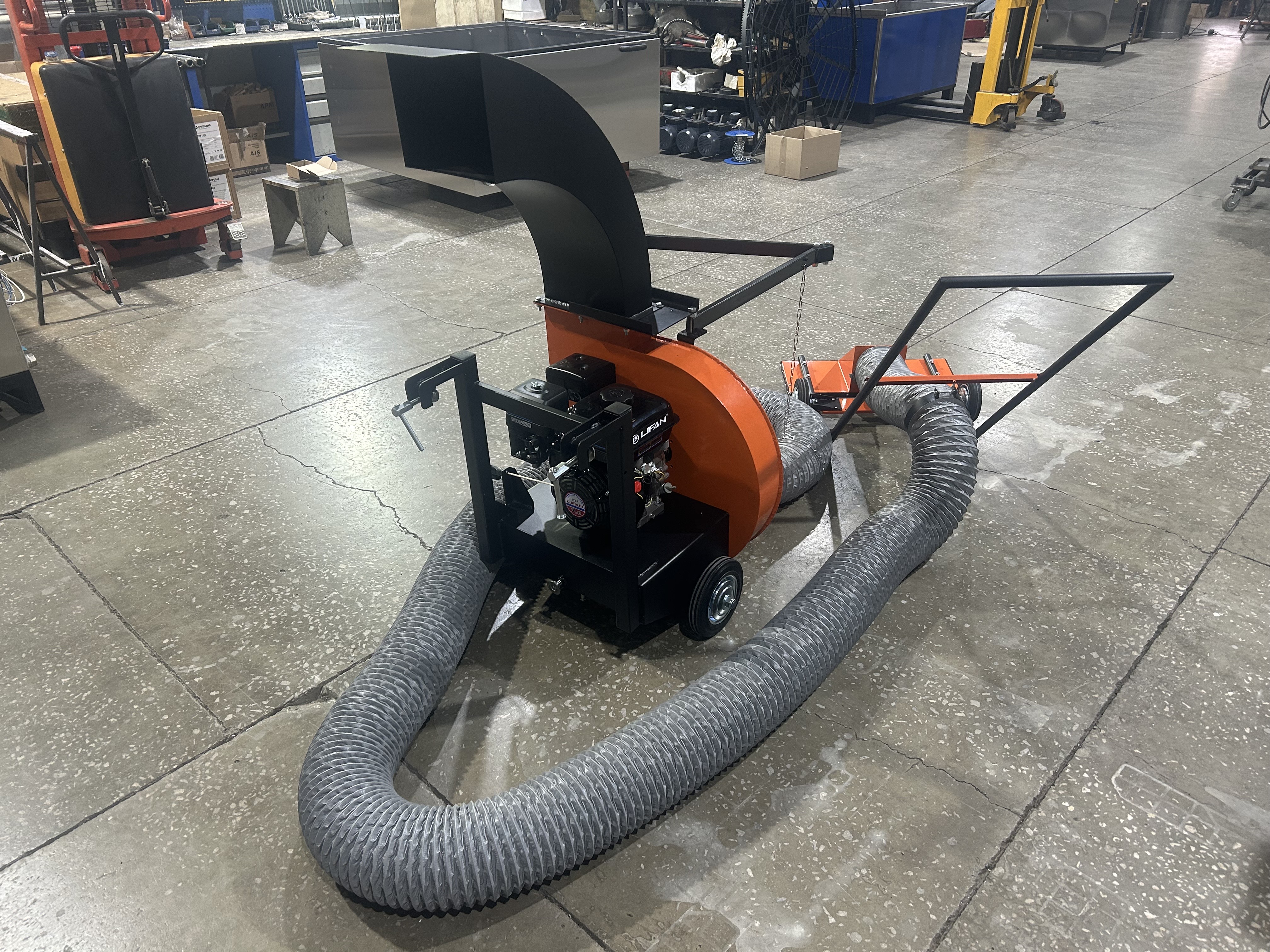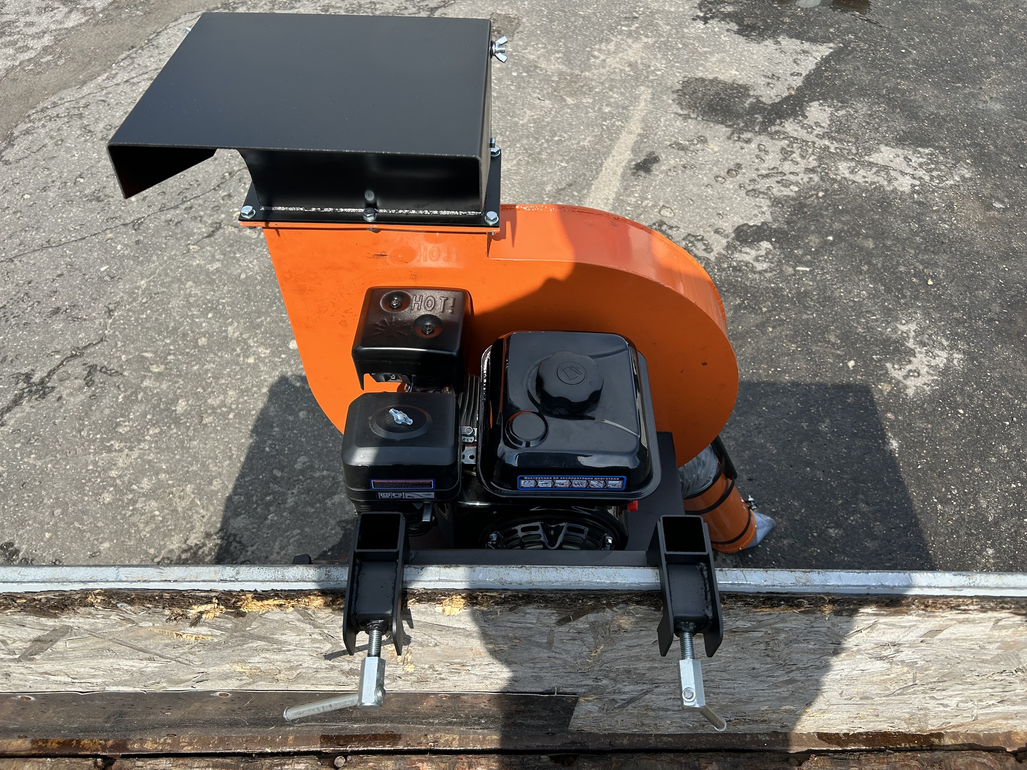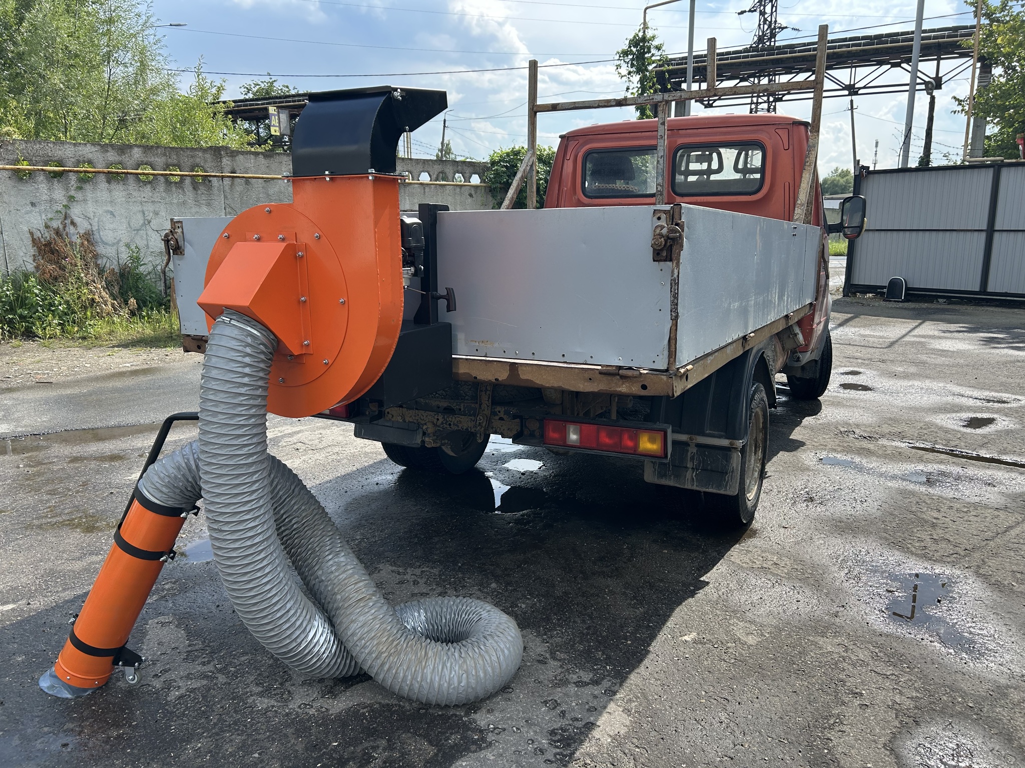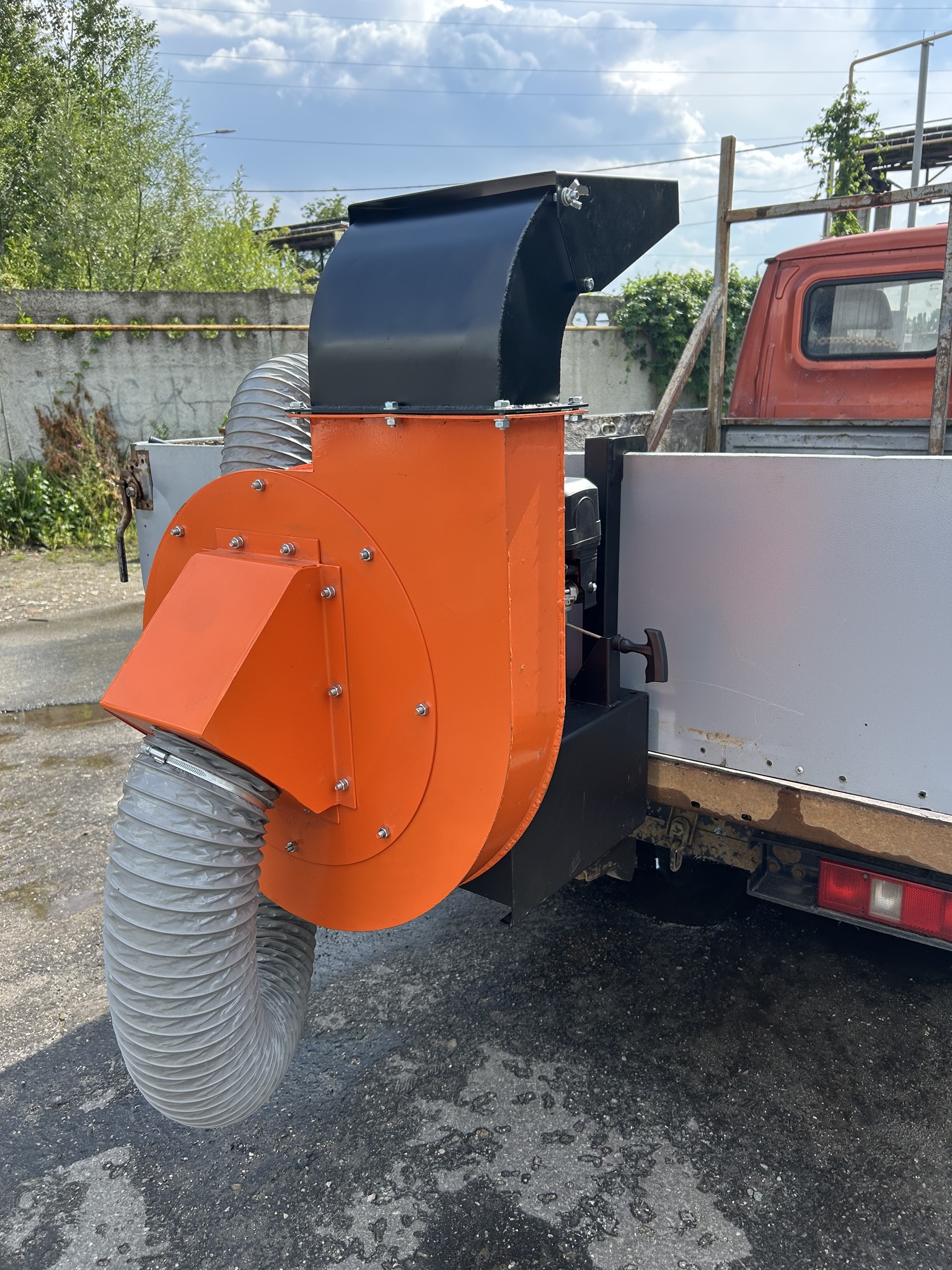 Крепление на борт тракторной тележки, бортовой газели, автомобильного прицепа. Выброс листвы и мусора осуществляется в кузов.